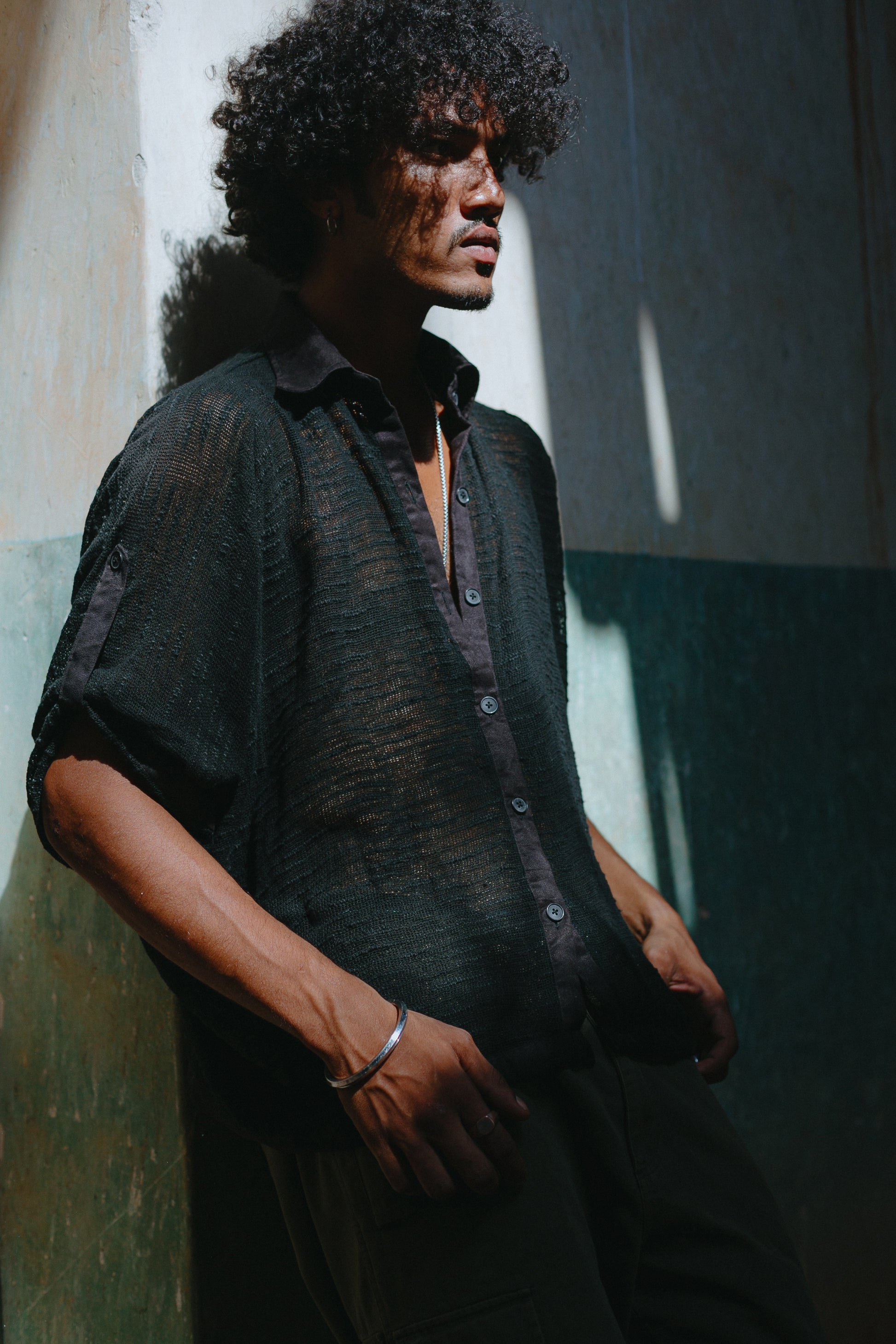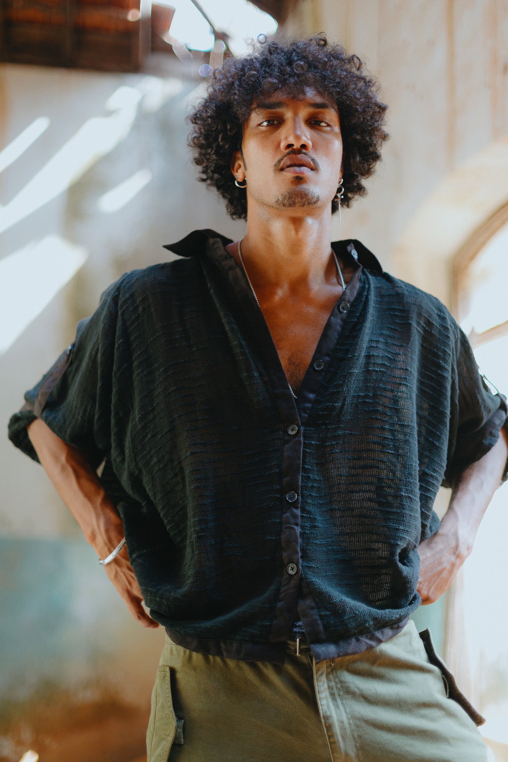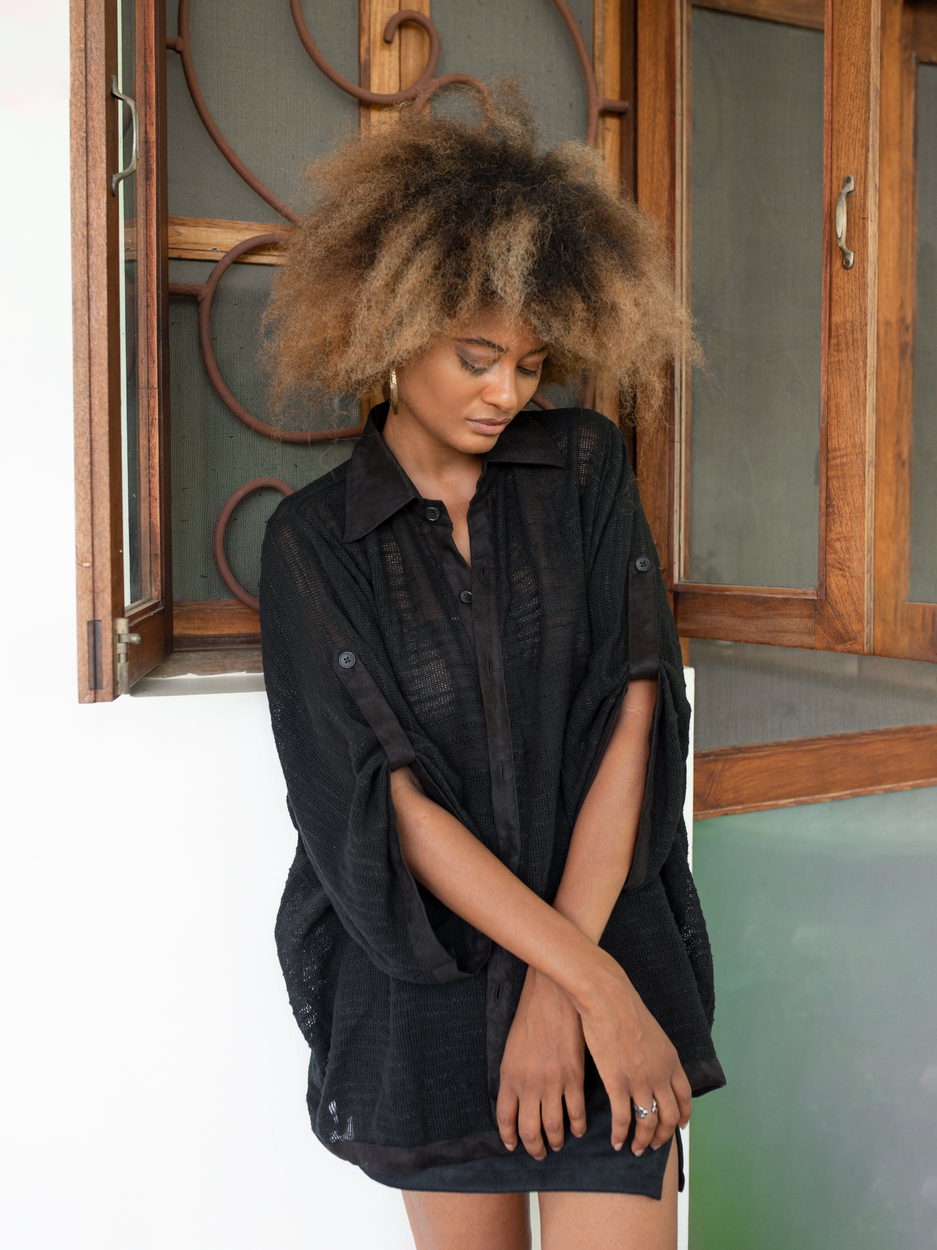 The most comfortable shirt, cut from a wrinkle-resistant, breathable handwoven cotton mesh. It has a super relaxed fit, 3/4 sleeves that can be raised and fastened at the elbows. The upcycled suede detailing is an accent. Offered in one universal size in naturally dyed Black and Dusty Mauve